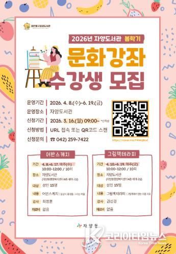코리아타임뉴스 대전취재본부 | 대전 동구는 ‘2026년 자양도서관 봄학기 문화강좌’를 운영하며, 이달 16일부터 동구 공공도서관 누리집을 통해 수강생을 선착순 모집한다고 밝혔다.