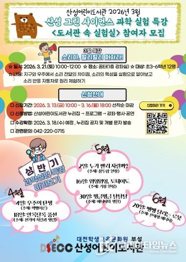 코리아타임뉴스 사회팀 | 대전학생교육문화원 부설 산성어린이도서관은 유·초등학생의 미래 역량 향상을 위한 ‘산성 그린 사이언스’ 상반기 프로그램을 3월부터 운영한다고 밝혔다.