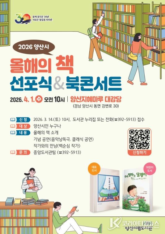 코리아타임뉴스 오영주 기자 | 양산시립도서관은 오는 4월 1일 오전 10시, 지혜마루 대강당에서‘2026년 올해의 책 선포식 및 북콘서트’를 개최한다.