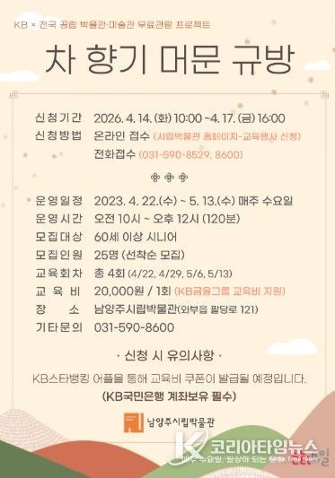 코리아타임뉴스 경기취재본부 | 남양주시는 오는 22일부터 남양주시립박물관이 시니어 대상 체험 프로그램 ‘차 향기 머문 규방’ 운영하고, 이에 앞서 14일부터 참여 신청을 받는다고 7일 밝혔다.