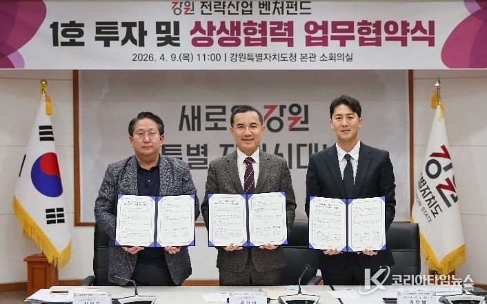 코리아타임뉴스 김택호 기자 | 강원특별자치도는 4월 9일, 도청 본관 회의실에서 강원 미래산업을 견인할 [강원 전략 산업 벤처펀드]의 첫 번째 투자기업으로 기능성 바이오 소재 기반 사료첨가제 제조기업인 [밸류라움바이오]를 선정하고 이를 기념하는 [강원 전략산업 벤처펀드 제1호 투자 및 상생협력 협약식]을 개최했다.
