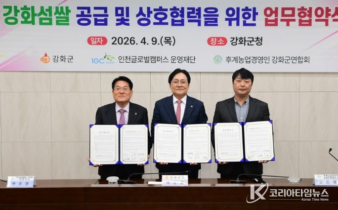 강화군은 9일, 인천글로벌캠퍼스운영재단(대표이사 변주영), (사)한국후계농업경영인 강화군연합회(회장 고진우)와 함께 ‘강화섬쌀 공급 및 상호 협력’을 위한 업무협약(MOU)을 체결했다고 밝혔다.