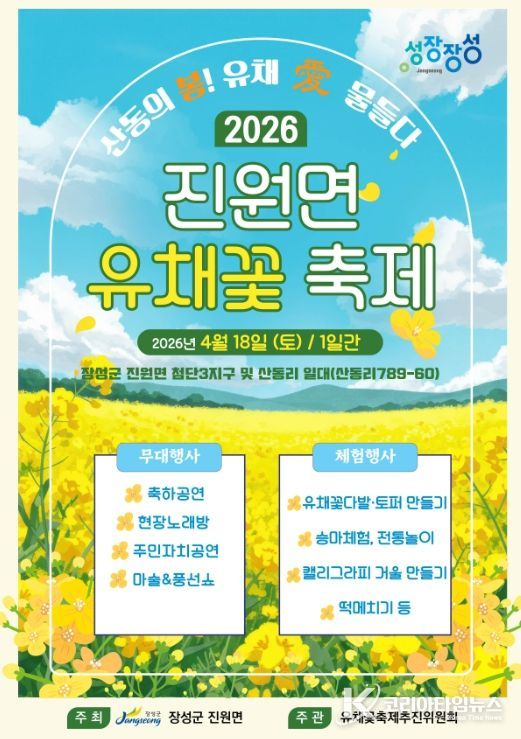코리아타임뉴스 노승선 기자 | 장성군 진원면 유채꽃 축제가 오는 18일 산동리에서 열린다.
