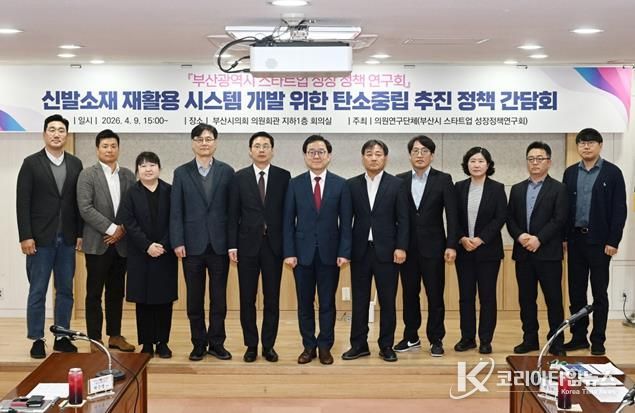 코리아타임뉴스 부산취재본부 | 부산광역시의회 의원연구단체인 '부산광역시 스타트업 성장 정책 연구회'는 4월 9일 오후 3시, 부산시의회 의원회관 회의실에서 ‘신발소재 재활용 시스템 개발을 통한 탄소중립 추진 정책 간담회’를 개최했다.