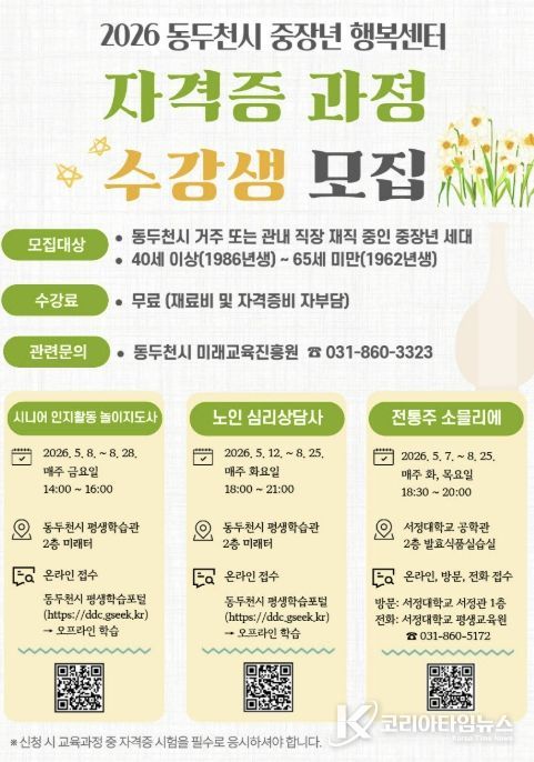 코리아타임뉴스 경기취재본부 | 동두천시 미래교육진흥원은 지역 내 중장년층의 성공적인 인생 2막과 안정적인 사회 참여를 지원하기 위해 ‘2026년 중장년 행복센터 자격증 과정’ 수강생을 모집한다고 밝혔다.
