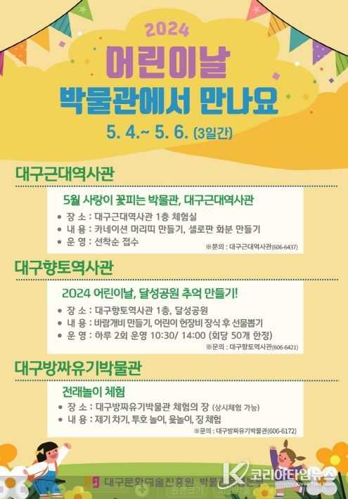 코리아타임뉴스 대구취재본부 | 2024년 어린이날을 맞아 (재)대구문화예술진흥원 박물관운영본부 소속 대구향토역사관, 대구근대역사관, 대구방짜유기박물관은 5월 4일부터 6일까지 3일간 어린이를 위한 문화행사를 개최한다.