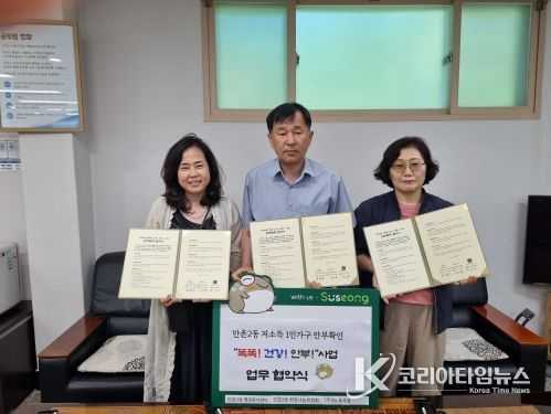 코리아타임뉴스 대구취재본부 | 대구 수성구 만촌2동은 지난 28일 만촌2동 희망나눔위원회, ㈜hy 효목점과 저소득 1인 가구의 건강과 안부를 확인하는 ‘똑똑! 건강! 안부!’ 사업 업무협약을 체결했다.