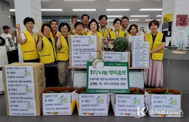 코리아타임뉴스 대구취재본부 | 대구 수성구 수성4가동 희망나눔위원회는 지난 11일 초복을 맞아 지역 어르신들의 건강한 여름나기를 위한 삼계탕, 떡, 수박(120만 원 상당)을 수성4가동 행정복지센터에 전달했다.