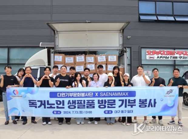 코리아타임뉴스 대구취재본부 | 다원 기부문화봉사단과 새남맥스(대표 정희원)는 지난 13일, 홀몸어르신들을 위해 생필품꾸러미 30박스(1천만원 상당)를 동구청에 기탁했다.