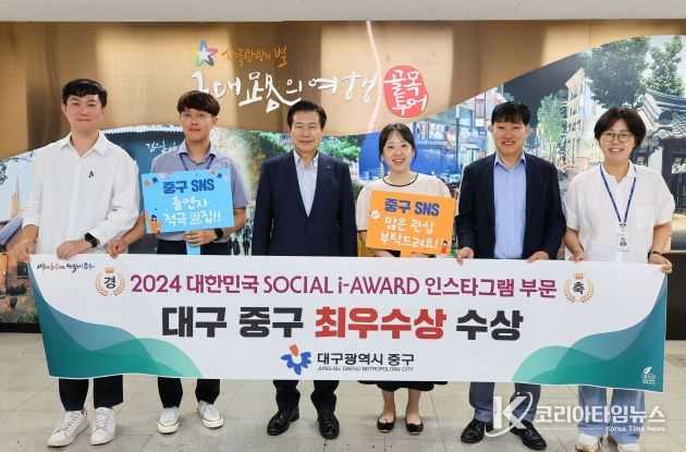 코리아타임뉴스 대구취재본부 | 대구 중구는 (사)한국인터넷전문가협회(KIPFA)가 주최하는 대한민국 소셜인터넷 서비스 혁신대상 시상식인 ‘소셜아이어워드(SOCIAL i-AWARD) 2024’에서 지방자치기관 군․구 부문 인스타그램 최우수상을 수상했다.