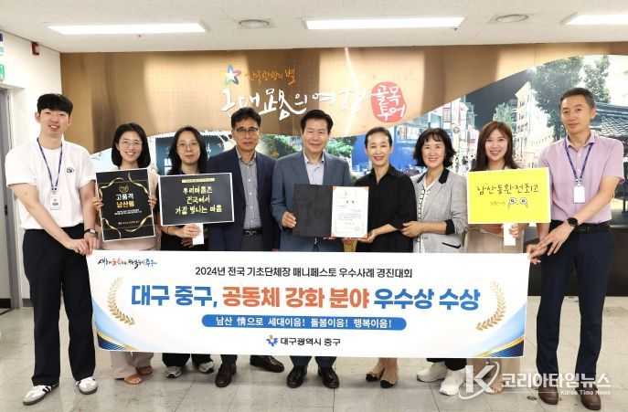 코리아타임뉴스 대구취재본부 | 대구 중구는 지난 31일 사)한국매니페스토실천본부와 경남연구원이 공동 주최한 ‘2024 전국 기초자치단체장 매니페스토 우수사례 경진대회’에서 ‘남산情으로 세대이음! 돌봄이음! 행복이음!’ 사례로 공동체 강화분야 우수상을 수상했다고 밝혔다.