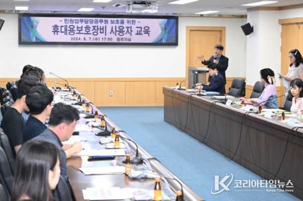 이번 교육은 휴대용 보호장비(웨어러블 캠)의 올바른 사용법과 운용기준, 보호장비 보안사항, 개인정보보호법 안내 등으로 진행됐으며, 교육 후에는 교육 참여자들과 함께 “악성민원인의 폭언·폭행으로부터 민원담당 공무원 보호”,“#악성민원 대응”등의 피켓을 들고 악성민원 근절 방지를 위한 피켓 챌린지도 펼쳐졌다.