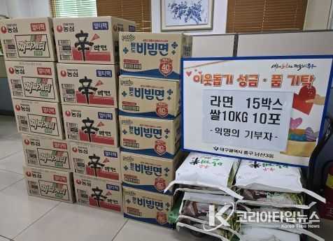 코리아타임뉴스 대구취재본부 | 남산3동 행정복지센터는 지난 12일 본인의 신상을 밝히지 않은 익명의 기부천사의 선물로 라면 15박스와 백미 10포가 기부됐다고 밝혔다.