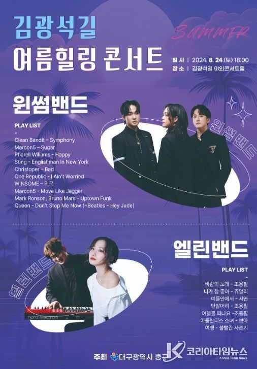코리아타임뉴스 대구취재본부 | 대구 중구는 24일 오후 6시 김광석길 야외콘서트홀에서 8월의 여름밤을 장식할 여름 힐링 콘서트를 개최한다.