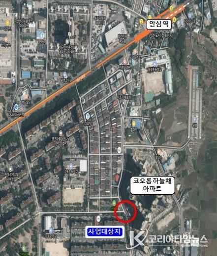 안심역코오롱하늘채 아파트 앞은 공동주택 출입구와 교차로가 인접해 있고 남북 간 교차로 길이가 길어 시야 확보가 어려우며, 공동주택 내 부지 협소 등으로 신호 운영에 한계가 있어, 이를 해결하기 위해 물방울형 회전교차로를 적용하기로 했다.
