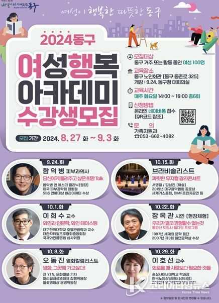 코리아타임뉴스 대구취재본부 | 대구 동구청은 27일부터 9월 3일까지 지역 여성 역량 강화를 위한 ‘동구 여성 행복아카데미’ 수강생을 모집한다.