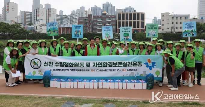 코리아타임뉴스 대구취재본부 | (사)자연보호대구중구협의회 회원 40여명은 27일 대표적인 휴식 공간인 수성교 아래 신천 일원에서 자연보호활성화와 생활 속 탄소중립 실천을 위한 신천정화활동 및 탄소중립 홍보‧캠페인을 펼쳤다.