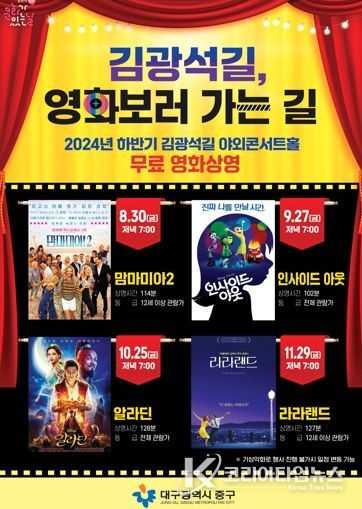 코리아타임뉴스 대구취재본부 | 대구 중구는 ‘문화가 있는 날’을 맞이해 11월까지 매월 마지막 주 금요일 김광석길 야외콘서트홀에서 주민들을 위한 무료 야외 영화관인 ‘김광석길 영화관’을 운영한다.