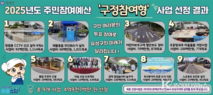 코리아타임뉴스 대전취재본부 | 대전 유성구는 지난 7일부터 27일까지 구민 온라인 투표를 통해 2025년도 ‘구 단위 주민참여예산(구정참여형)’ 사업을 최종 선정했다고 1일 밝혔다.