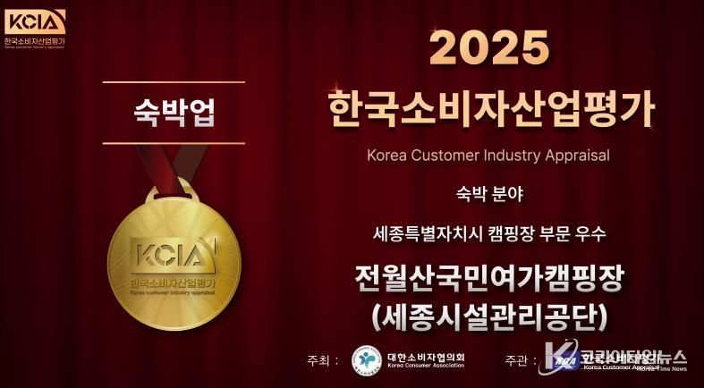 코리아타임뉴스 세종취재분부 | 세종특별자치시시설관리공단은 합강캠핑장과 전월산캠핑장이 대한소비자협회가 주최하고 한국소비자평가가 주관하는 ‘2025 KCIA 한국소비자산업평가-숙박업’ 부문에서 우수 숙박시설로 선정됐다고 밝혔다.