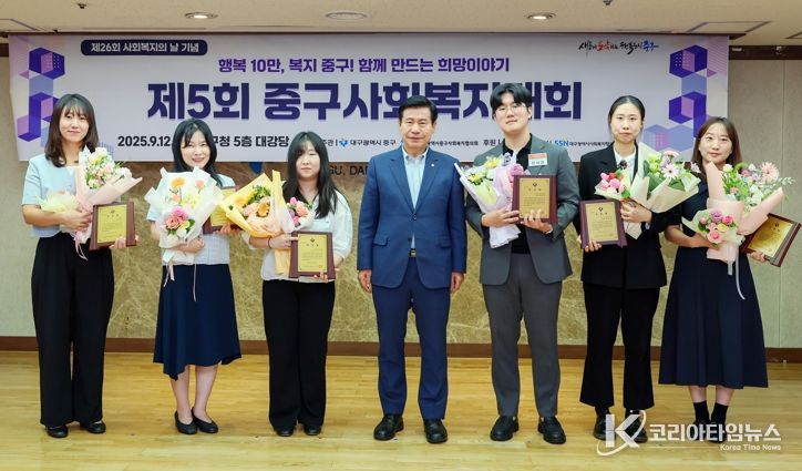 코리아타임뉴스 대구취재본부 | 대구 중구는 12일 구청 대강당에서 제26회 사회복지의 날(9월 7일)과 사회복지주간을 기념해 사회복지 증진에 이바지한 종사자들의 노고를 격려하고, 2026년 시행 예정인 통합돌봄사업의 성공적 추진을 위한 ‘제5회 중구사회복지대회 및 통합돌봄 민관협력 세미나’를 개최했다.