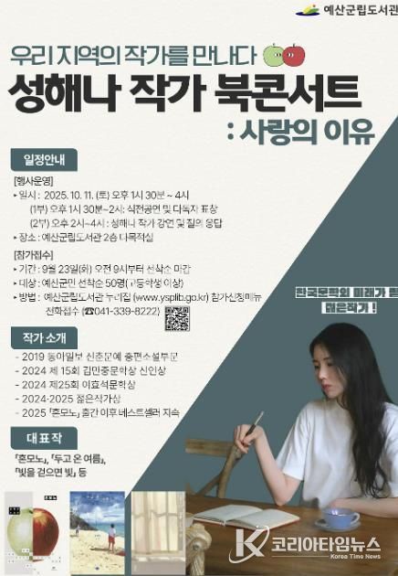 코리아타임뉴스 김택호 기자 | 예산군립도서관은 오는 10월 11일 오후 1시 30분부터 도서관 2층 다목적실에서 출간 이후 현재까지 온라인 서점 베스트셀러를 유지하고 있는 소설 ‘혼모노’의 저자 성해나 작가를 초청해 북콘서트를 개최한다고 밝혔다.