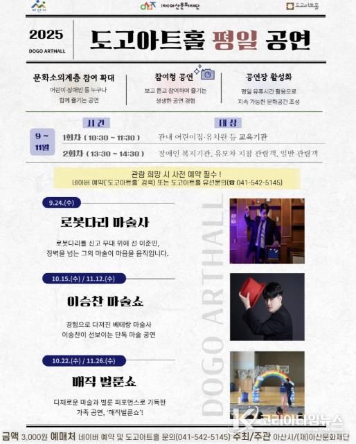 코리아타임뉴스 김택호 기자 | 아산문화재단이 운영하는 도고아트홀이 2025년 9월부터 11월까지 평일 기획 공연을 진행한다. 이번 사업은 관내 어린이집·유치원 등 교육기관과 장애인 복지기관을 대상으로 기획됐으며, 지역 주민 누구나 함께 즐길 수 있는 문화 향유 기회를 제공한다.