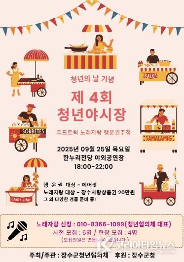 코리아타임뉴스 전북취재본부 | 장수군은 오는 25일 오후 6시부터 장수한누리전당 야외공연장에서 ‘제4회 청년의 날 기념 장수 청년 야시장’을 개최한다고 밝혔다.