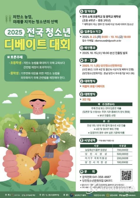 코리아타임뉴스 김택호 기자 | (재)당진시청소년재단 당진청소년문화의집은 오는 11월 1일 ‘2025 전국 청소년 디베이트 대회(부제: 저탄소 농업, 미래를 지키는 청소년의 선택)’를 개최한다고 밝혔다.
