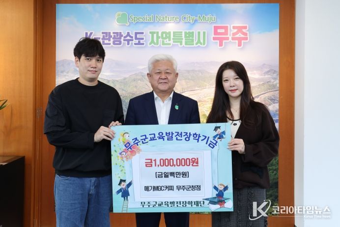 코리아타임뉴스 전북취재본부 | 메가MGC커피 무주군청점에서 지난 23일 (재)무주군교육발전장학재단(이사장 황인홍 무주군수)에 장학금 1백만 원을 기탁했다.