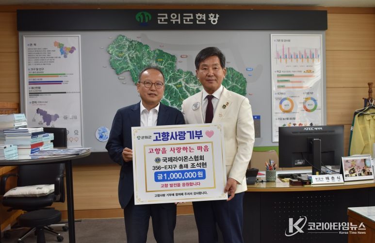 코리아타임뉴스 윤경수 기자 | 군위군은 국제라이온스협회 356-E(경북)지구 조석현 총재(제38대)가 지난 23일 군위군청을 방문하여 고향사랑기부금 100만원을 전달했다고 밝혔다.