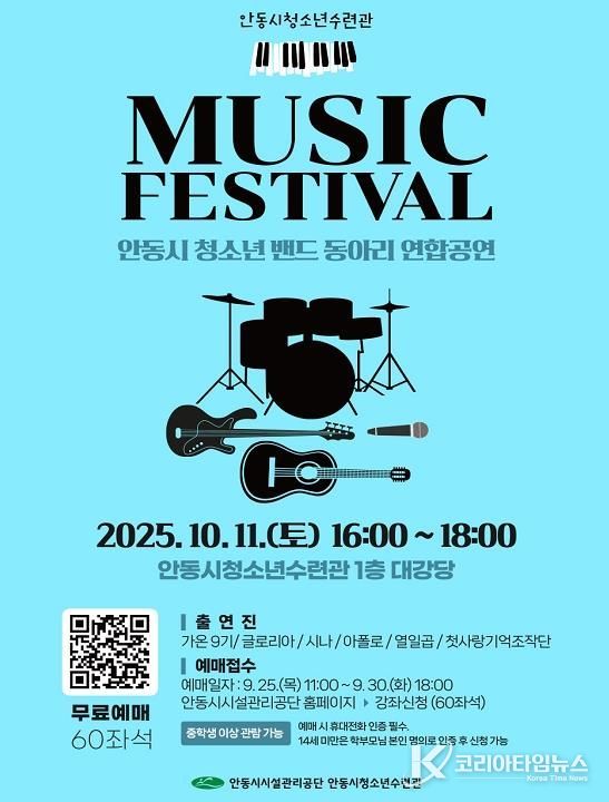 코리아타임뉴스 윤경수 기자 | 안동시시설관리공단에서 운영하는 안동시청소년수련관이 '2025 안동시 청소년 밴드 동아리 연합공연 ‘뮤직 페스티벌’'을 오는 10월 11일 청소년수련관 대강당에서 개최한다고 밝혔다.