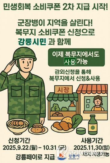 코리아타임뉴스 윤경수 기자 | 강릉시는 민생회복 소비쿠폰 2차 개선 사항인 군 장병 복무지 신청을 위하여, 9월 24일부터 관내 부대를 대상으로 '민생회복 소비쿠폰 군 장병 대상 찾아가는 신청 서비스'를 운영한다.