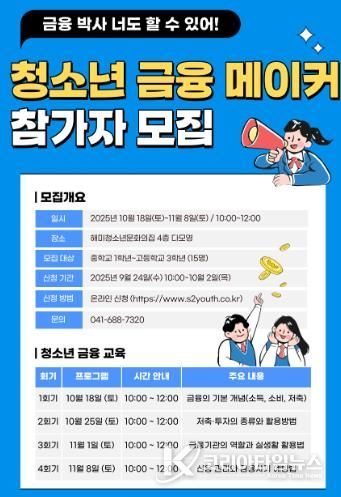 코리아타임뉴스 김택호 기자 | 해미청소년문화의집은 오는 24일부터 2025년 청소년 특성화 프로그램‘청소년 금융 메이커’참가자를 모집한다고 밝혔다.