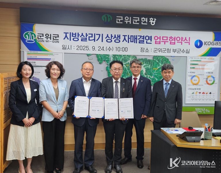코리아타임뉴스 윤경수 기자 | 군위군과 한국가스공사(사장 최연혜)는 9월 24일 수요일 오전 10시 군위군청 부군수실에서 지방살리기 상생 자매결연 업무협약을 체결했다. 지방살리기 상생 자매결연 업무협약은 비수도권 인구감소지역의 경제 활성화와 인구 유입을 위해 중앙정부와 공공기관, 지자체가 협력하는 공식 협약이다.