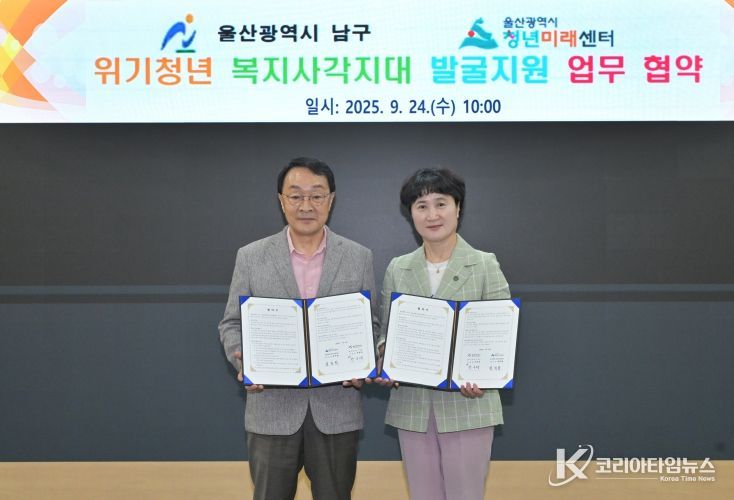 코리아타임뉴스 윤경수 기자 | 울산 남구(구청장 서동욱)는 24일 구청 3층 소회의실에서 울산청년미래센터(센터장 정치락)와 복지사각지대 해소를 위한 업무협약을 체결하고, 센터 임·직원을 명예사회복지공무원으로 위촉해 고립·은둔 및 가족돌봄 청년 지원을 위한 협력체계를 강화했다.