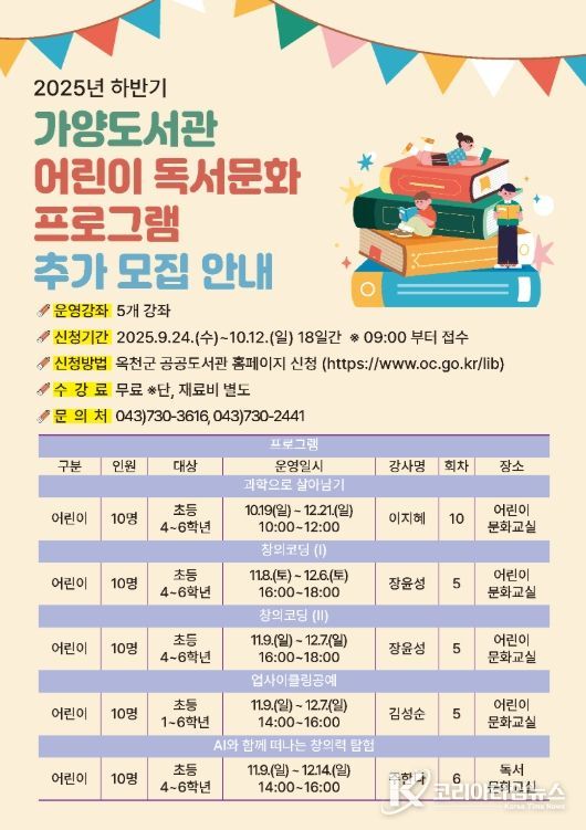 코리아타임뉴스 충북취재본부 | 옥천 가양도서관은 군민의 독서문화활동을 지원하기 위해 하반기 어린이 독서문화프로그램 수강생을 추가 모집한다.