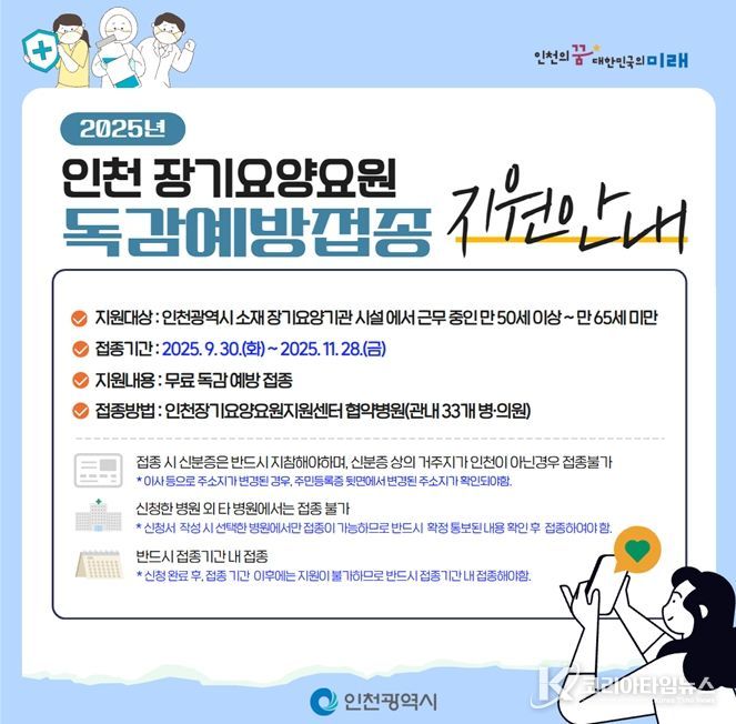 코리아타임뉴스 윤경수 기자 | 인천광역시는 노인 감염취약시설인 장기요양기관 종사자 1만여 명의 건강권 확보와 처우 개선을 위해 오는 9월 30일부터 11월 28일까지 약 9주간 무료 독감 예방접종을 실시한다고 밝혔다.