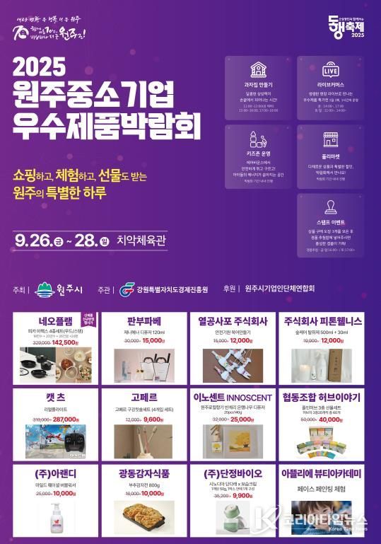 코리아타임뉴스 한장선 객원기자 | 원주시가 주최하고 강원특별자치도경제진흥원이 주관하는 ‘2025 원주 중소기업 우수제품 박람회’가 오는 26일 오전 10시 30분, 치악체육관 무대에서 개막식을 열고 28일까지 3일간 이어지는 행사의 막을 올린다.