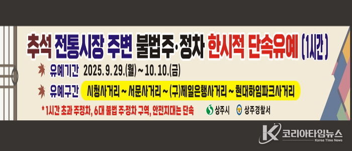코리아타임뉴스 윤경수 기자 | 상주시는 민족 고유의 명절인 추석을 맞아 전통시장 활성화와 귀성객들의 편의를 위해 전통시장 주변 불법주·정차 단속을 한시적으로 유예한다.