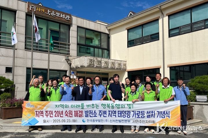 코리아타임뉴스 충남취재본부 | 서천군 서면은 지난 23일, 신서천발전본부와 서면주민자치회 간 4천만원 규모의 태양광 가로등 설치사업 지원을 위한 기념식을 가졌다고 밝혔다.