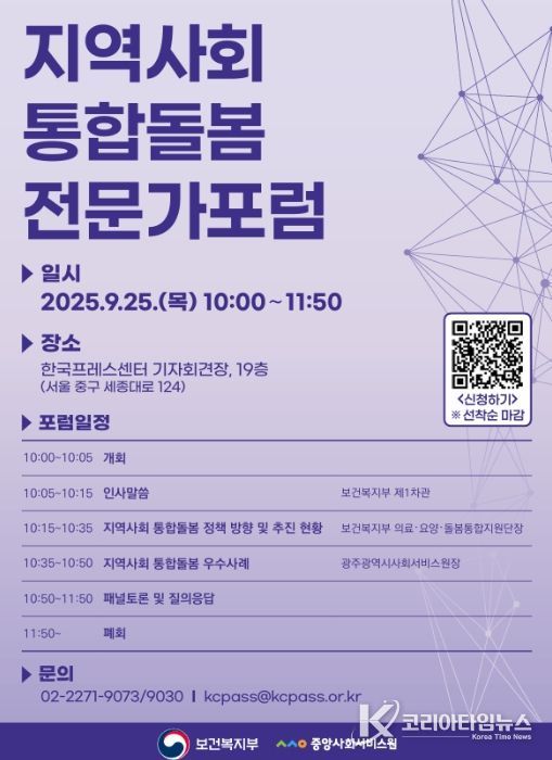 코리아타임뉴스 윤경수 기자 | 보건복지부와 중앙사회서비스원은 9월 25일 오전 10시, 한국프레스센터(서울시 중구 소재)에서 ‘지역사회 통합돌봄 정책 방향 및 추진현황’을 주제로 전문가 포럼을 개최했다.