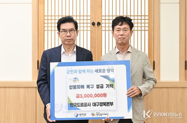 코리아타임뉴스 윤경수 기자 | 한국도로공사 대구경북본부는 지난 24일 김광열 영덕군수를 만나 산불로 큰 피해를 본 주민들을 돕기 위해 성금 300만 원을 기탁했다.