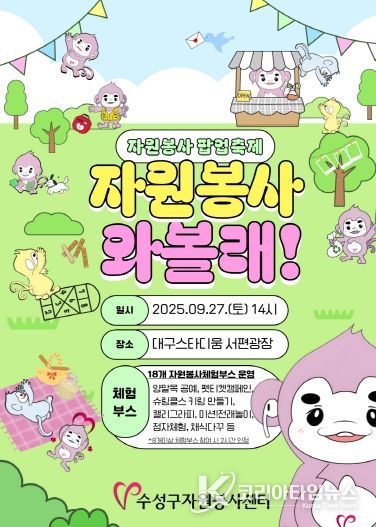 코리아타임뉴스 대구취재본부 | 대구 수성구자원봉사센터(센터장 이기덕)는 오는 27일 대구스타디움 서편광장에서 '자원봉사 팝업축제, 자원봉사 와볼래'를 개최한다. 이번 축제는 지역 주민들이 일상 속에서 자원봉사를 쉽게 체험하고, 자연스러운 참여 문화를 확산하기 위해 마련됐다.