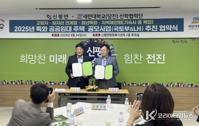 코리아타임뉴스 김택호 기자 | 당진시 신평면은 지난 24일 신평면 행정복지센터 회의실에서 세한대학교와 국토교통부와 LH가 추진하는 공공임대주택 사업과 관련해 수요처 의향 협약을 체결했다고 26일 밝혔다.