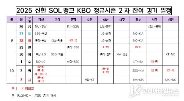 코리아타임뉴스 스포츠팀 | KBO는 26일(금) 2025 신한 SOL뱅크 KBO 정규시즌 2차 잔여 경기 일정을 확정했다.