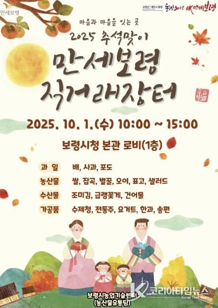코리아타임뉴스 충남취재본부 | 보령시는 추석을 맞아 10월 1일 보령시청 본관 1층 로비에서 ‘2025 추석맞이 만세보령 농특산물 직거래장터’를 운영한다고 밝혔다.