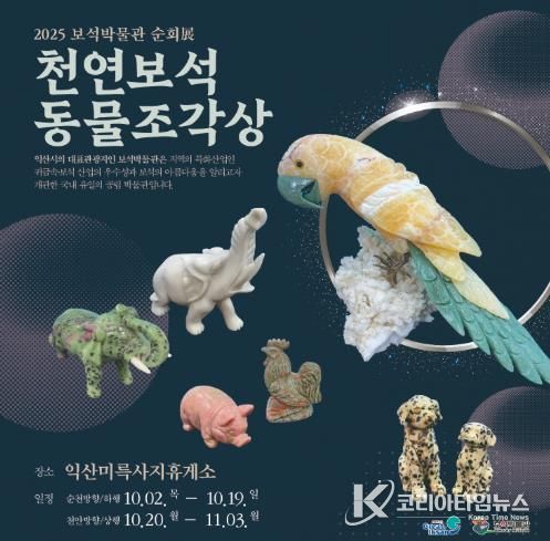 코리아타임뉴스 전북취재본부 | 익산시 보석박물관은 추석 연휴가 시작되는 10월 2일부터 11월 3일까지 익산미륵사지휴게소(양방향)에서 '천연보석 동물조각상' 순회전시를 진행한다.