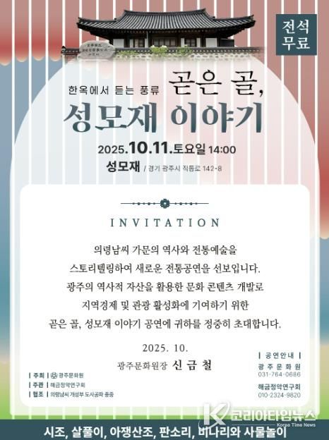 코리아타임뉴스 이아름 기자 | 광주문화원은 성모재(직동로142-8)에서 2025년 10월 11일 14:00 시민들을 대상으로 “제10회 광주시 문화의 날 행사” 를 개최한다고 밝혔다.