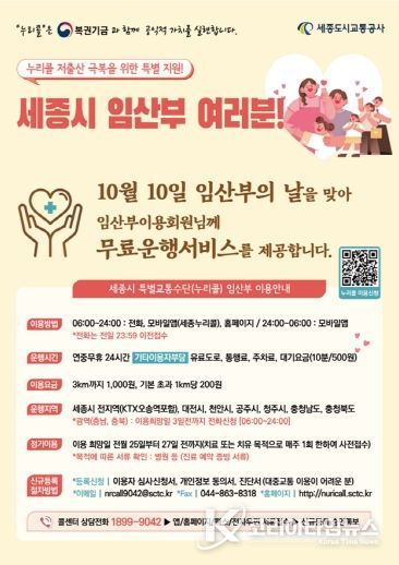 코리아타임뉴스 세종취재분부 | 세종도시교통공사는 오는 10월 10일 ‘임산부의 날’을 맞아 이날 하루 특별교통수단 누리콜 차량을 무료로 운행한다고 밝혔다.